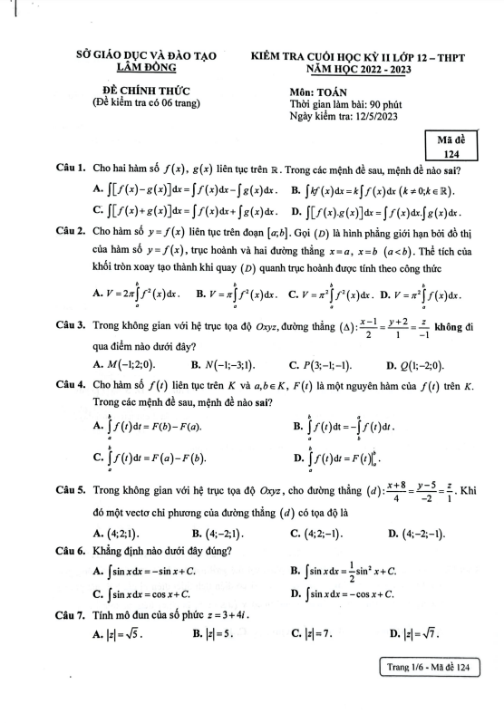 Chào các thầy cô và các em học sinh lớp 12! Hôm nay, chúng ta sẽ cùng điểm qua đề kiểm tra cuối học kỳ 2 môn Toán lớp 12 THPT năm học 2022 – 2023 do Sở Giáo dục và Đào tạo tỉnh Lâm Đồng tổ chức. Kỳ thi sẽ diễn ra vào ngày 12 tháng 05 năm 2023, với các mã đề 121 – 122 – 123 – 124.