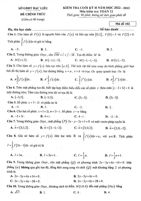 Đề kiểm tra cuối học kì 2 (HK2) lớp 12 môn Toán năm 2022 2023 sở GDKHCN Bạc Liêu