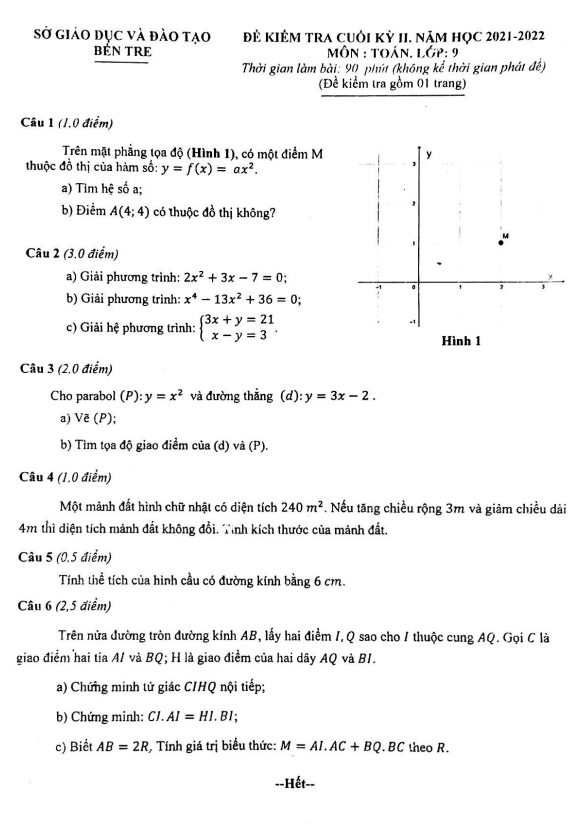 Chào mừng đến với đề kiểm tra cuối học kì 2 môn Toán lớp 9 năm học 2021 – 2022 của sở Giáo dục và Đào tạo tỉnh Bến Tre! Đề thi sẽ diễn ra vào thứ Ba ngày 26 tháng 04 năm 2022. Dưới đây là một số câu hỏi trong đề thi: