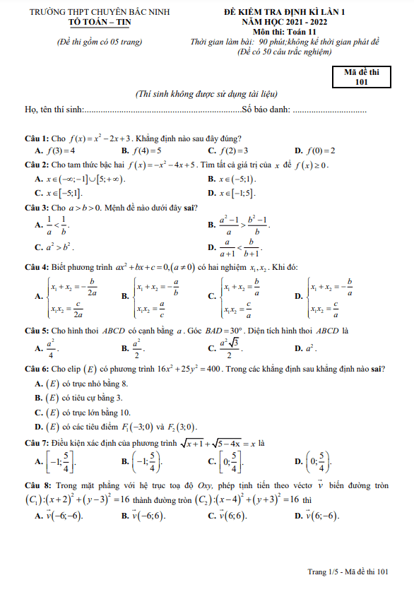 Đề kiểm tra định kỳ lần 1 môn Toán lớp 11 năm 2021 – 2022 trường THPT chuyên Bắc Ninh, mã đề 101, bao gồm 50 câu trắc nghiệm trên 05 trang, thời gian làm bài 90 phút. Kỳ thi diễn ra giữa học kì 1, năm học 2021 – 2022, với đáp án chi tiết các mã đề 101 đến 108.