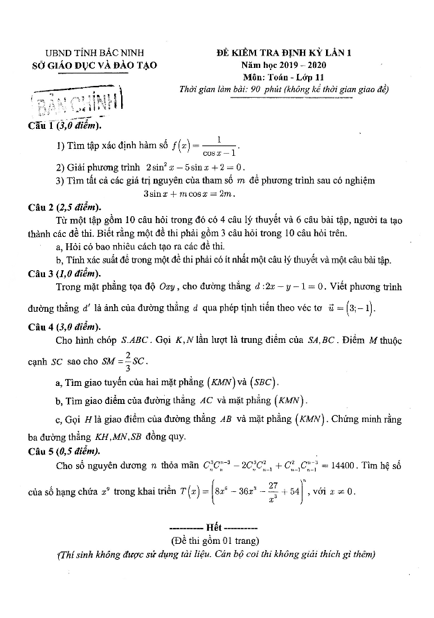 Đề kiểm tra định kỳ lần 1 lớp 11 môn Toán năm 2019 2020 sở GD ĐT Bắc Ninh