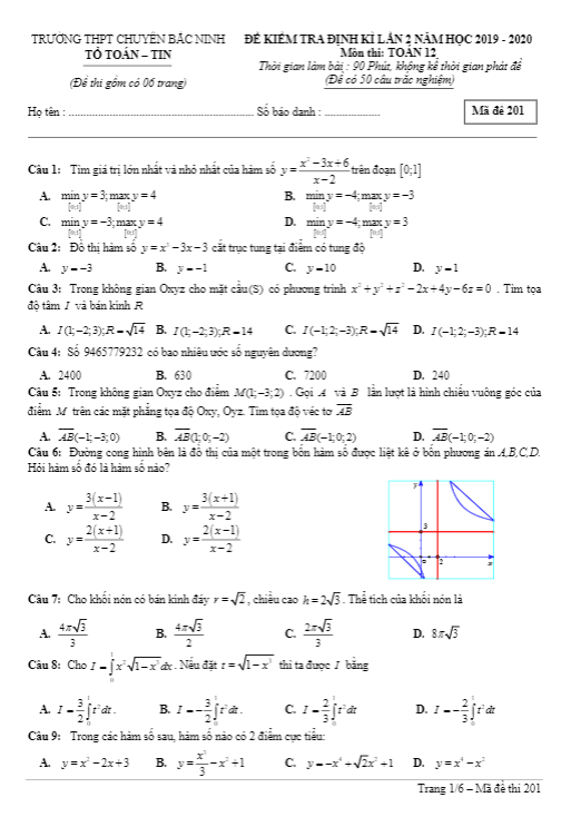 Buổi sáng đẹp trời, vào ngày …. tháng 12 năm 2019, trường THPT chuyên Bắc Ninh đã tổ chức kỳ thi kiểm tra chất lượng định kỳ lần thứ hai môn Toán lớp 12 năm học 2019-2020. Đây là một bước quan trọng nhằm đánh giá tình hình học tập môn Toán của học sinh khối 12 và rèn luyện để chuẩn bị cho kỳ thi THPT Quốc gia môn Toán năm 2020.Đề kiểm tra định kỳ lần 2 Toán lớp 12 năm 2019-2020 trường chuyên Bắc Ninh đã được biên soạn một cách cẩn thận. Đề gồm 50 câu hỏi và bài toán, được thiết kế theo hình thức trắc nghiệm trên 06 trang giấy. Thời gian làm bài là 90 phút, đủ để học sinh làm và kiểm tra kiến thức của mình. Đề thi có đáp án mã số từ 201 đến 208, giúp học sinh tự kiểm tra và đánh giá bài làm của mình sau khi kết thúc bài thi.Một trong những câu hỏi trong đề thi là về một chiếc cốc hình nón cụt và một viên bi có đường kính bằng chiều cao của cốc. Học sinh cần phải tính tỉ số bán kính của miệng cốc và đáy cốc dựa trên thông tin cho sẵn. Câu hỏi này đòi hỏi học sinh có kiến thức vững về hình học không gian và khả năng suy luận logic.Đề thi cũng đặt ra một bài toán về việc gửi tiết kiệm với số tiền khác nhau và lãi suất khác nhau. Học sinh cần phải tìm ra lãi suất x% mỗi quý để có thể tính toán số tiền và lãi sau một năm. Đây là một bài toán có tính ứng dụng cao, giúp học sinh nhận biết và hiểu rõ hơn về vấn đề tiết kiệm và lãi suất.Trong đề thi cũng xuất hiện một bài toán về hình nón tròn xoay, đòi hỏi học sinh phải có kiến thức vững về hình học không gian để giải quyết. Bài toán này cần sự tỉ mỉ và chính xác để tính toán diện tích của thiết diện cắt qua hình nón.Tóm lại, đề kiểm tra định kỳ lần 2 Toán lớp 12 năm 2019-2020 trường chuyên Bắc Ninh là một cơ hội để học sinh thể hiện kiến thức và kỹ năng của mình trong môn Toán. Đồng thời, đây cũng là bước chuẩn bị quan trọng trước kỳ thi THPT Quốc gia, giúp học sinh tự tin và sẵn sàng cho những thách thức phía trước.