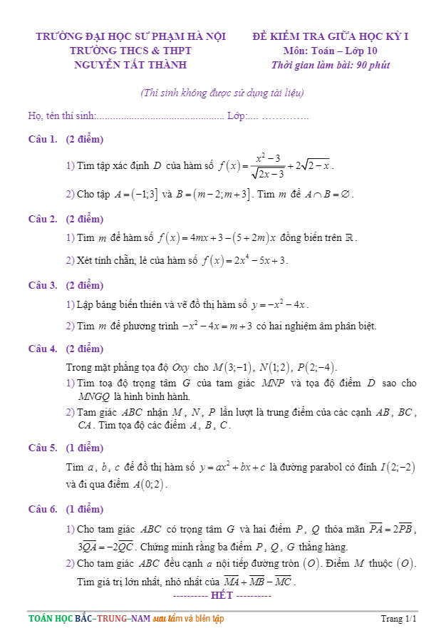 Đề kiểm tra giữa học kỳ 1 Toán lớp 10 năm 2018 – 2019 trường Nguyễn Tất Thành – ĐHSP Hà Nội