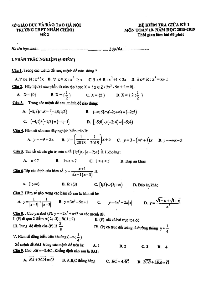 Đề kiểm tra giữa học kì 1 (HK1) lớp 10 môn Toán năm 2018 2019 trường THPT Nhân Chính Hà Nội