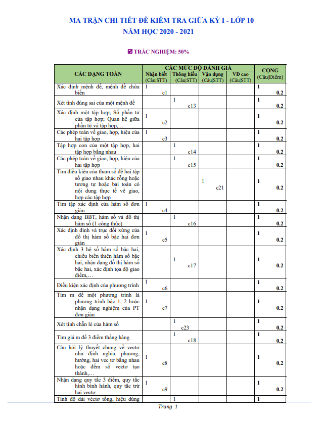 Đề kiểm tra giữa kì 1 Toán lớp 10 năm 2020 – 2021 trường THPT Mỹ Đức C – Hà Nội
