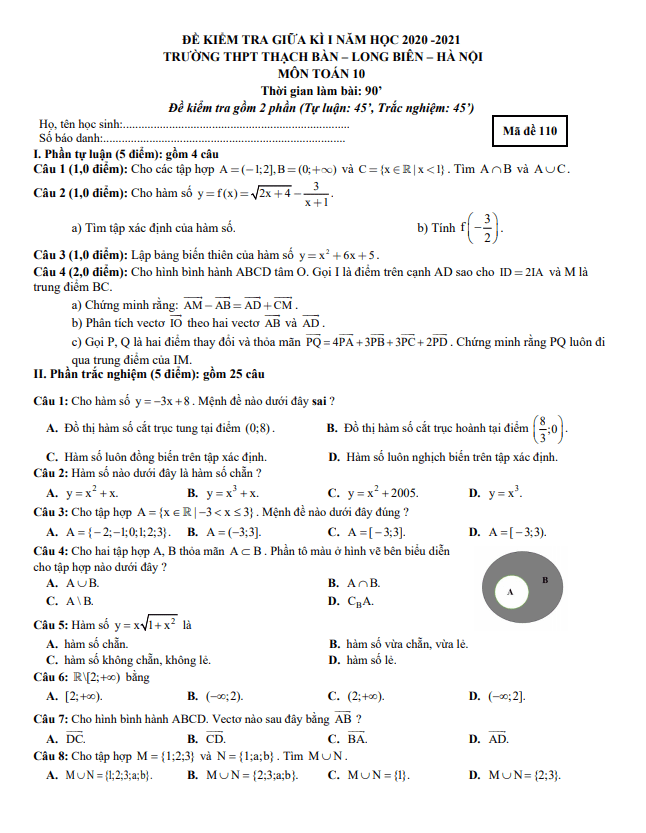Vào ngày … tháng 11 năm 2020, trường THPT Thạch Bàn tại Hà Nội đã tổ chức kiểm tra giữa học kì 1 môn Toán cho học sinh lớp 10. Đề kiểm tra bao gồm 3 trang với 2 phần: trắc nghiệm và tự luận. Phần tự luận có 4 câu, tổng điểm là 5 điểm với thời gian làm bài 45 phút. Phần trắc nghiệm có 25 câu, tổng điểm là 5 điểm với thời gian làm bài 45 phút. Đề thi đi kèm đáp án và lời giải chi tiết có mã đề 110.