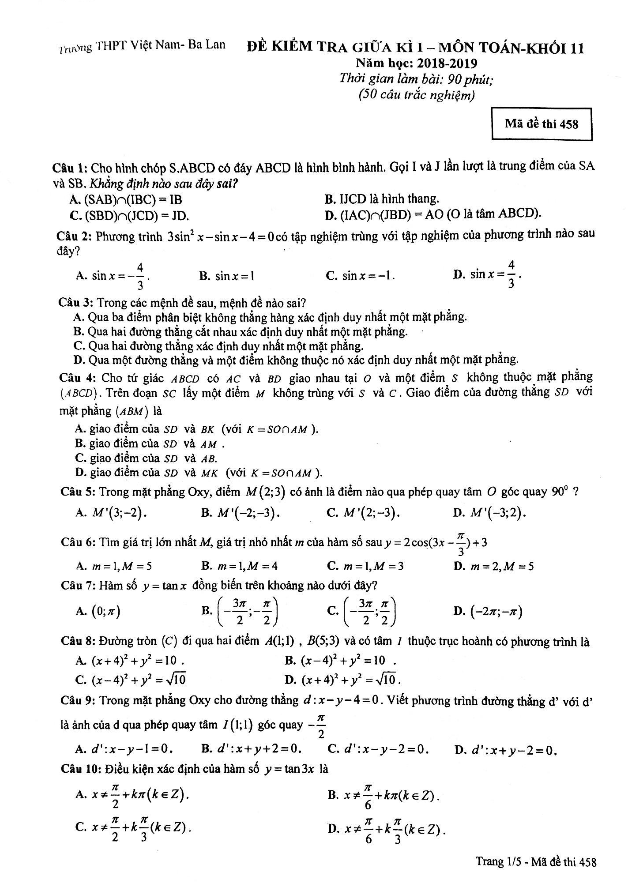 Đề kiểm tra giữa kì 1 Toán lớp 11 năm 2018 – 2019 trường THPT Việt Nam – Ba Lan – Hà Nội