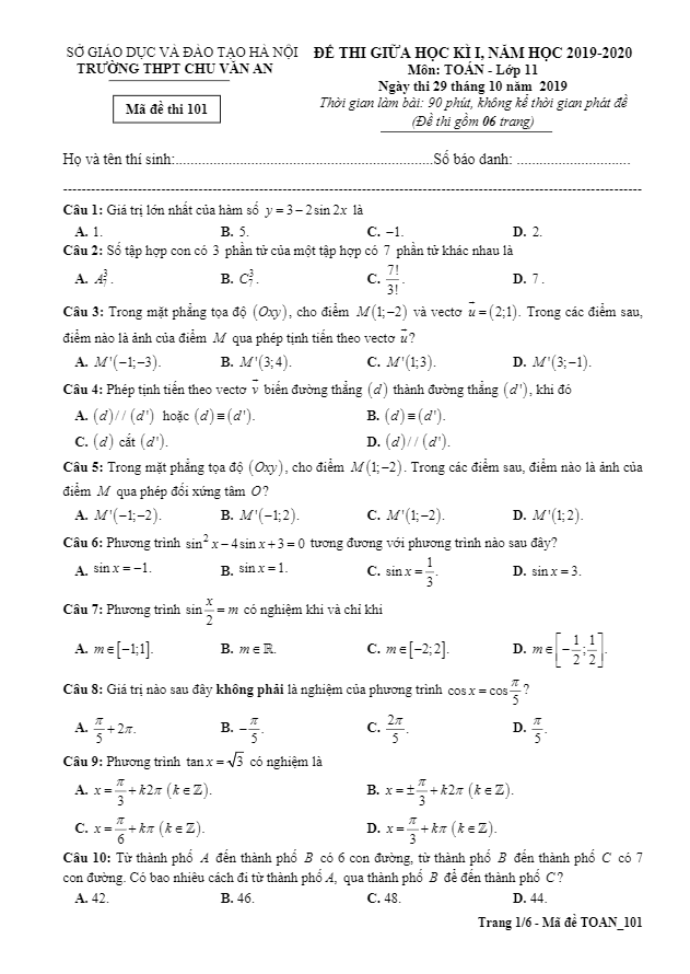 Trong buổi sáng ngày 29 tháng 11 năm 2019, học sinh trường THPT Chu Văn An – Hà Nội đã tham gia kỳ thi kiểm tra giữa học kì 1 môn Toán lớp 11 trong năm học 2019-2020. Đề kiểm tra giữa HK1 Toán của lớp 11 năm 2019-2020 tại trường này có mã đề 101, bao gồm 06 trang với tổng cộng 50 câu hỏi và bài toán, thời gian làm bài là 90 phút.
