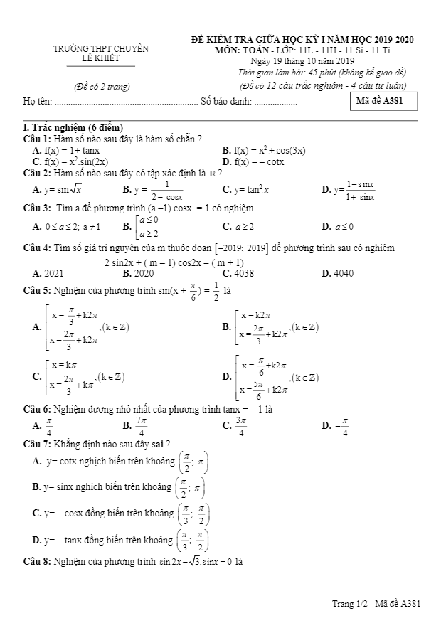 Đề kiểm tra giữa học kỳ 1 môn Toán lớp 11 năm học 2019-2020 trường THPT chuyên Lê Khiết tập trung vào chủ đề về hàm số lượng giác và phương trình lượng giác. Đề thi có mã đề A381 và được sử dụng cho các lớp chuyên Hóa học, Vật lý, Sinh học và Tin học.