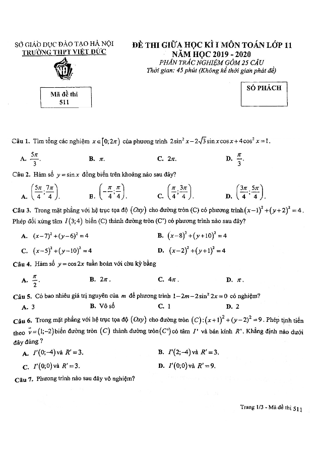 Đề kiểm tra giữa kì 1 Toán lớp 11 năm 2019 – 2020 trường THPT Việt Đức – Hà Nội