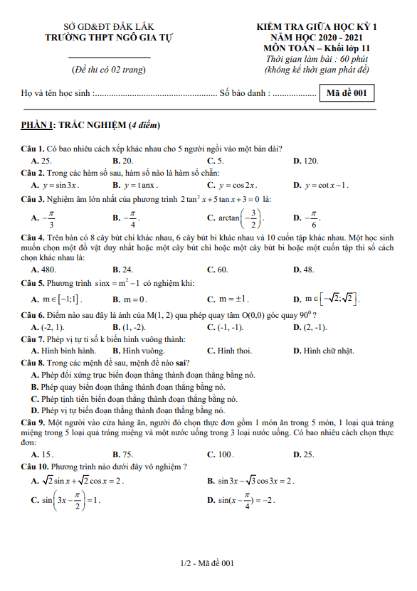 Đề kiểm tra giữa học kì 1 (HK1) lớp 11 môn Toán năm 2020 2021 trường THPT Ngô Gia Tự Đắk Lắk