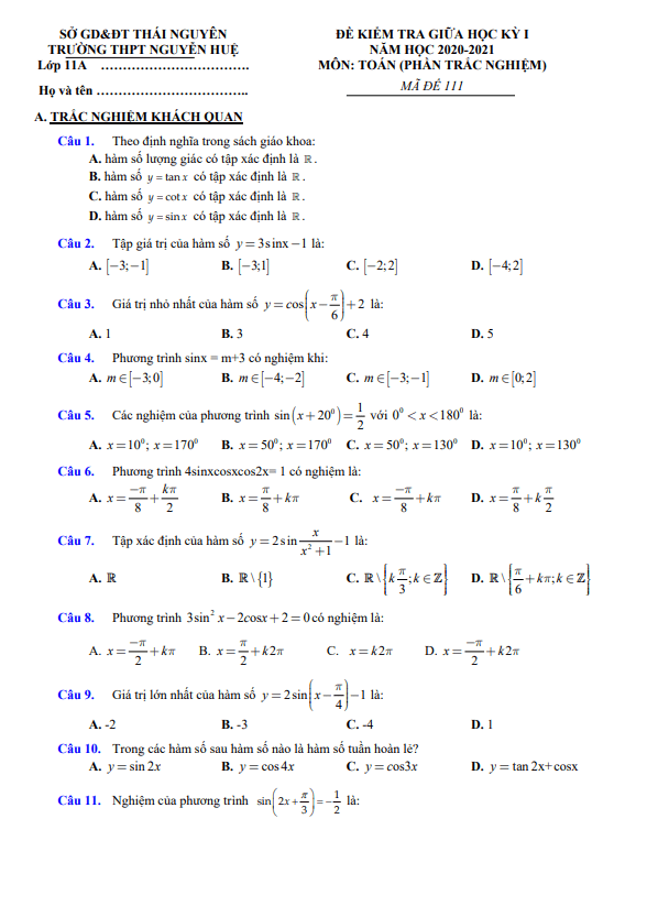 Đề kiểm tra giữa học kì 1 môn Toán lớp 11 năm 2020 – 2021 của trường THPT Nguyễn Huệ Thái Nguyên mang mã đề 111. Đề bao gồm 03 trang, được biên soạn theo dạng đề trắc nghiệm kết hợp với tự luận. Phần trắc nghiệm có 20 câu hỏi, phần tự luận có 04 câu hỏi, thời gian làm bài thi là 90 phút.