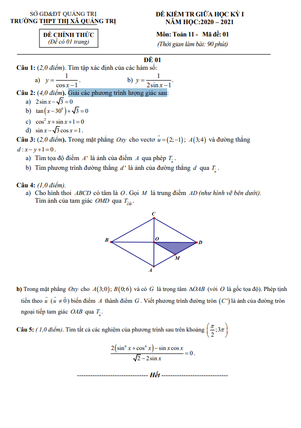 Đề kiểm tra giữa học kỳ 1 môn Toán lớp 11 năm học 2020 – 2021 tại trường THPT thị xã Quảng Trị là một bài kiểm tra được biên soạn theo dạng đề tự luận. Đề thi bao gồm 01 trang với tổng cộng 05 bài toán, thời gian làm bài là 90 phút. Bài thi cung cấp lời giải chi tiết và thang điểm cho học sinh.
