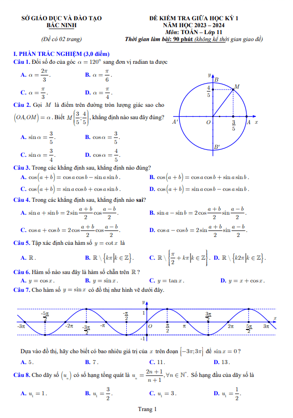 Trích đoạn từ Đề kiểm tra Toán lớp 11 năm 2023 – 2024 sở GD&ĐT Bắc Ninh: