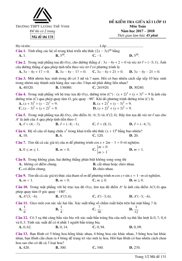 Đề kiểm tra giữa kỳ 1 Toán lớp 11 năm học 2017 – 2018 trường THPT Lương Thế Vinh – Hà Nội