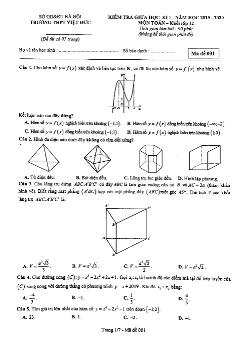 Vào Thứ Tư ngày 09 tháng 10 năm 2019, trường THPT Việt Đức (Hoàn Kiếm – Hà Nội) đã tổ chức kiểm tra giữa học kì 1 môn Toán lớp 12 năm học 2019 – 2020. Đề kiểm tra có mã đề 001, được biên soạn theo dạng trắc nghiệm với 50 câu hỏi và bài toán, thời gian làm bài 90 phút. Nội dung kiểm tra bao gồm các chủ đề: ứng dụng đạo hàm để khảo sát và vẽ đồ thị hàm số, khối đa diện và thể tích của chúng, cũng như các câu hỏi bám sát đề thi THPT Quốc gia môn Toán.