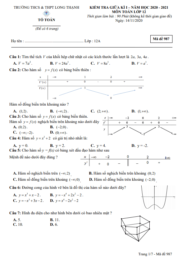 Kỳ thi giữa kỳ 1 Toán lớp 12 năm 2020 – 2021 tại trường THCS & THPT Long Thạnh Kiên GiangThời gian và địa điểm: Kỳ thi diễn ra vào Thứ Bảy ngày 14 tháng 11 năm 2020 tại trường THCS & THPT Long Thạnh, huyện Giồng Riềng, tỉnh Kiên Giang.Nội dung kỳ thi: Đề kiểm tra giữa kì 1 Toán lớp 12 năm 2020 – 2021 tại trường này được biên soạn dưới dạng bài trắc nghiệm với 50 câu hỏi và bài toán. Thí sinh có 90 phút để hoàn thành bài thi mà không tính thời gian phát đề. Đề thi đi kèm với đáp án để học sinh tự kiểm tra và đánh giá kết quả.Một số câu hỏi thú vị trong đề thi:– Trong ngành kỹ thuật điện, việc nối các điện trở theo một hình 3D nhất định để trích điện áp ra đôi khi gợi nhớ đến loại hình đa diện đều nào trong Toán học.- Hình đa diện đều nào tượng trưng cho Không khí trong 5 loại hình đa diện đều được coi là biểu tượng của sự sống.- Liên kết phân tử của một chất hóa học được mô hình hóa như một khối đa diện đều nào.File WORD: Đề thi được cung cấp dưới dạng file WORD để quý thầy cô giáo sử dụng và chuẩn bị cho học sinh.Kỳ thi giữa kỳ 1 Toán lớp 12 tại trường THCS & THPT Long Thạnh Kiên Giang ngoài việc đánh giá kiến thức của học sinh còn giúp học sinh phát triển kỹ năng giải quyết vấn đề, logic và tư duy toán học. Đây cũng là dịp để các em thể hiện khả năng và kiến thức mà mình đã tích lũy được trong quá trình học tập.