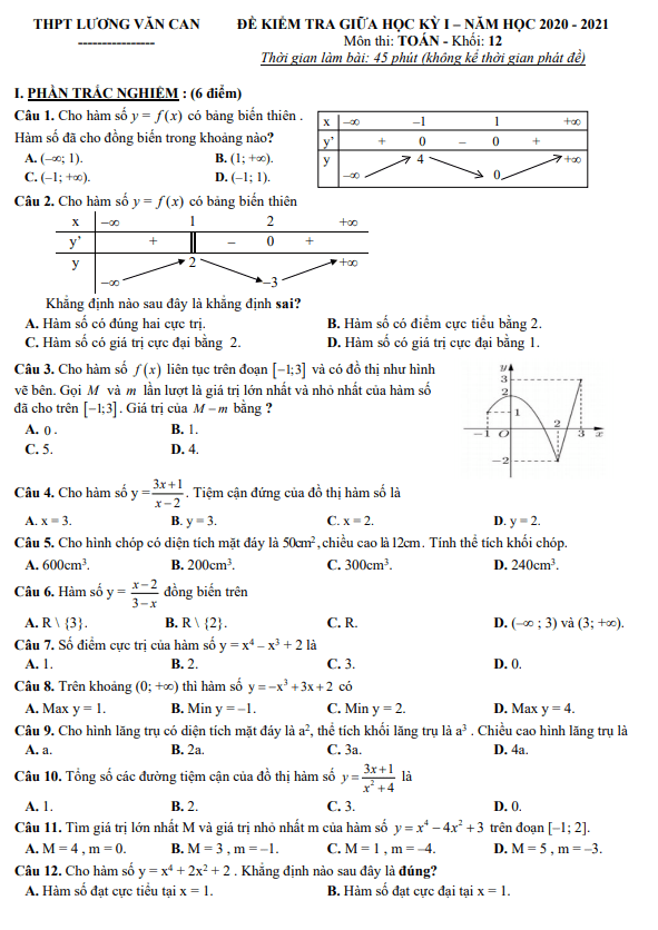 Trích dẫn một số câu hỏi từ đề kiểm tra giữa HK1 Toán lớp 12 năm 2020 – 2021 tại trường THPT Lương Văn Can: