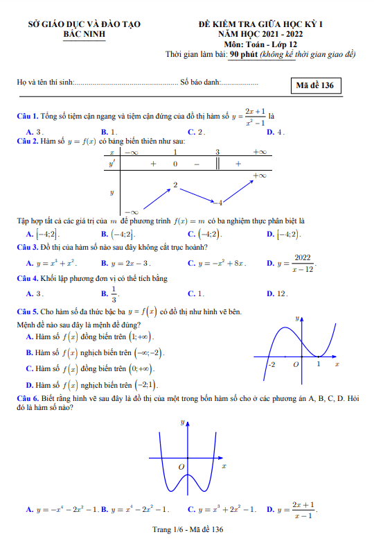 Vào ngày Thứ Năm 11 tháng 11 năm 2021, Sở Giáo dục và Đào tạo tỉnh Bắc Ninh đã tổ chức kỳ thi kiểm tra chất lượng môn Toán lớp 12 trong giai đoạn giữa học kỳ 1 năm học 2021 – 2022. Đề kiểm tra này gồm 50 câu trắc nghiệm, được thiết kế trên 06 trang và có mã đề là 136. Thời gian làm bài là 90 phút (không bao gồm thời gian phát đề), và đề thi đi kèm với đáp án mã đề 136, 248, 396, 678.