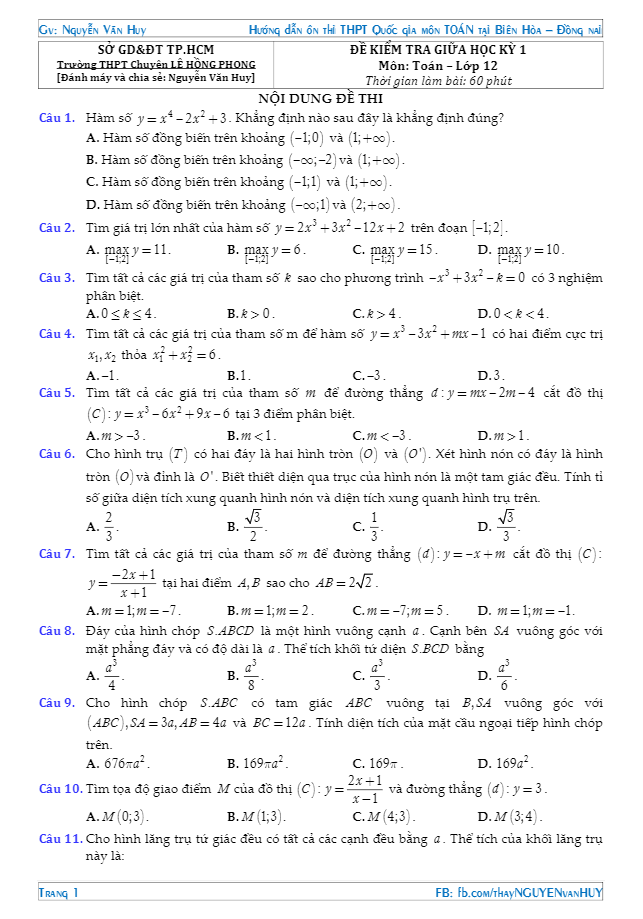 Đề kiểm tra giữa học kỳ 1 môn Toán lớp 12 trường THPT chuyên Lê Hồng Phong – TP. HCM