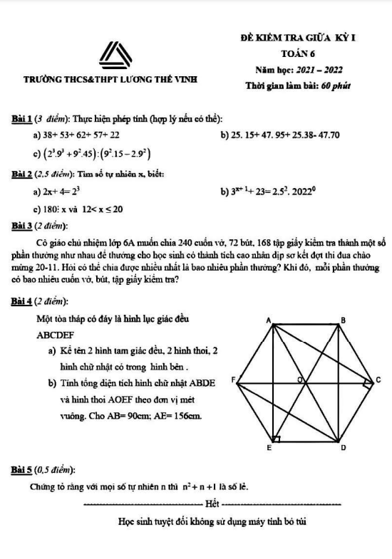 Đề kiểm tra giữa kỳ 1 môn Toán lớp 6 năm học 2021 – 2022 tại trường Lương Thế Vinh ở Hà Nội được thiết kế gồm 01 trang bài với 05 bài toán dạng tự luận. Thời gian làm bài cho kỳ thi này là 60 phút, đảm bảo đủ thời gian cho học sinh thực hiện các bài toán một cách cẩn thận và chính xác. Kỳ thi sẽ diễn ra vào ngày chưa được xác định cụ thể trong tháng 10 năm 2021.