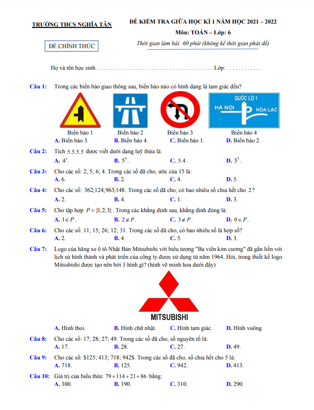 Trích dẫn đề kiểm tra giữa học kì 1 Toán lớp 6 năm 2021-2022 trường THCS Nghĩa Tân – Hà Nội: