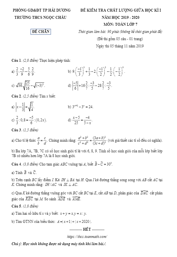 Đề kiểm tra giữa học kì 1 (HK1) lớp 7 môn Toán năm 2019 2020 trường Ngọc Châu Hải Dương