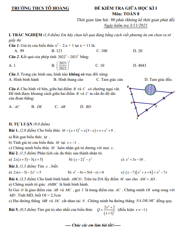 Đề kiểm tra giữa học kì 1 Toán lớp 8 năm 2021-2022 trường THCS Tô Hoàng – Hà Nội