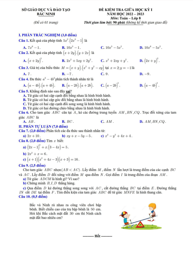 Đề kiểm tra giữa học kỳ 1 (HK1) lớp 8 môn Toán năm 2022-2023 sở GD ĐT Bắc Ninh