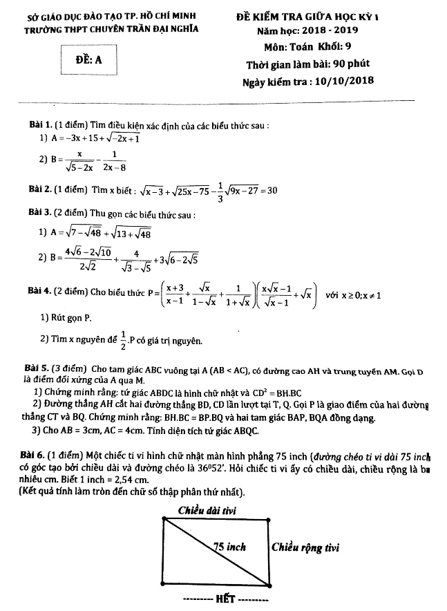 Đề kiểm tra giữa học kỳ 1 Toán lớp 9 năm 2018 – 2019 trường chuyên Trần Đại Nghĩa – TP. HCM