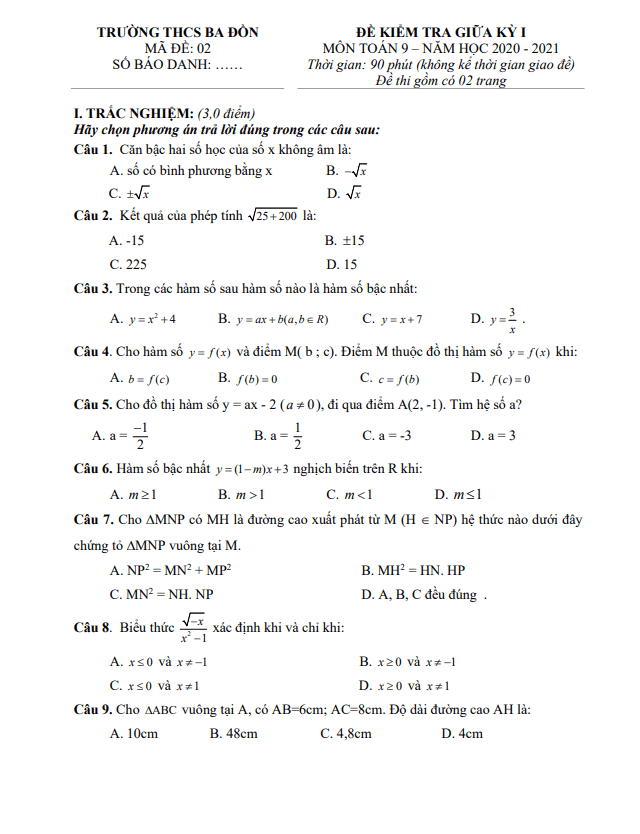 Đề kiểm tra giữa kỳ 1 Toán lớp 9 năm 2020 – 2021 trường THCS Ba Đồn – Quảng Bình
