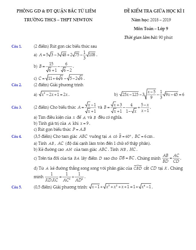Đề kiểm tra giữa học kỳ 1 Toán lớp 9 năm học 2018 – 2019 trường Newton Hà Nội