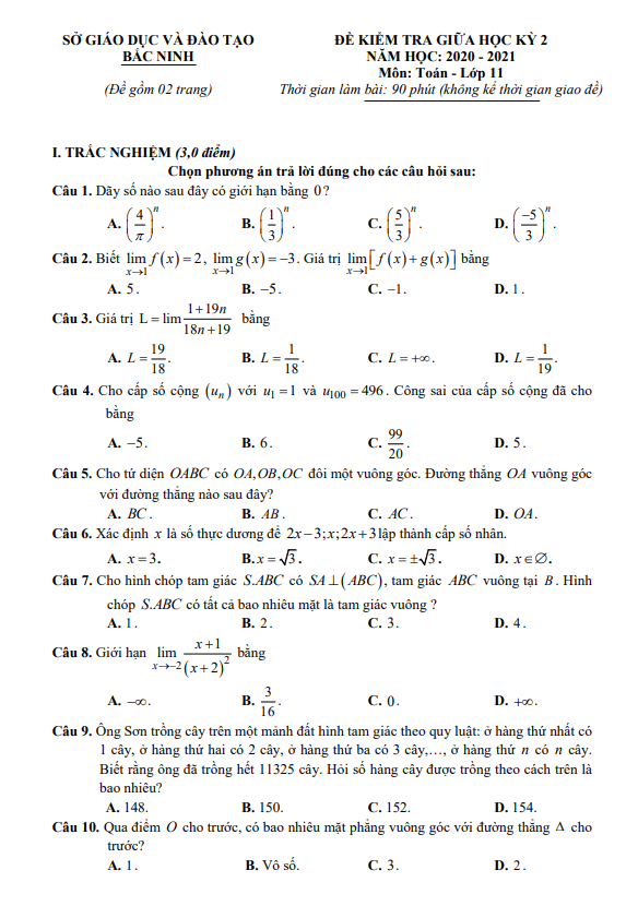 Đề thi giữa học kì 2 môn Toán lớp 11 năm 2020-2021