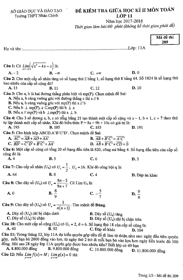 Đề kiểm tra giữa học kì 2 Toán lớp 11 năm học 2017 – 2018 trường THPT Nhân Chính – Hà Nội mã đề 209 gồm 3 trang với 30 câu hỏi trắc nghiệm khách quan, thời gian làm bài 60 phút, kỳ kiểm tra được tổ chức vào ngày 12 tháng 03 năm 2018.