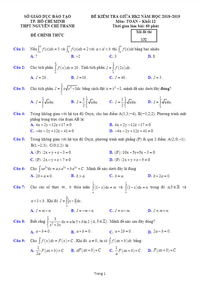 Đề kiểm tra có mã đề 132, được biên soạn với 30 câu hỏi trắc nghiệm và bài toán. Thời gian làm bài là 60 phút. Đề thi nhằm kiểm tra lại kiến thức Toán lớp 12 mà các em đã học từ đầu học kỳ 2 đến nay. Cụ thể, đề bao gồm các chủ đề: nguyên hàm, tích phân và ứng dụng, phương pháp tọa độ trong không gian Oxyz.