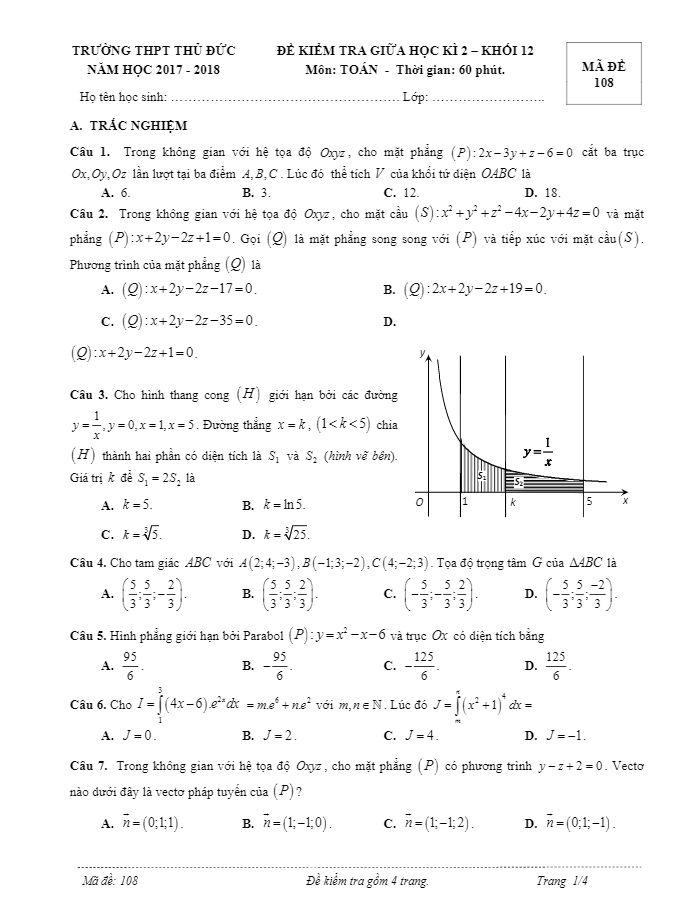 Đề kiểm tra giữa học kì 2 môn Toán lớp 12 năm học 2017 – 2018 của trường THPT Thủ Đức TP. HCM có mã đề 108, bao gồm 4 trang với tổng cộng 30 câu hỏi trắc nghiệm và 3 bài toán tự luận. Thí sinh sẽ có thời gian làm bài trong 60 phút, và đề kiểm tra đi kèm đáp án và lời giải chi tiết.