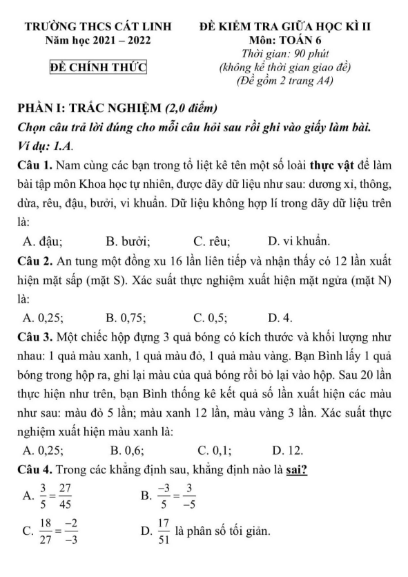 Đề kiểm tra Toán lớp 6 HK2 năm 2021-2022 trường THCS Cát Linh