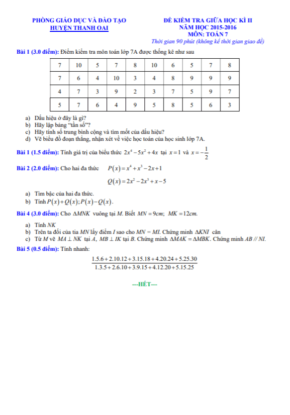 Đề kiểm tra giữa học kì 2 (HK2) lớp 7 môn Toán năm 2015 2016 phòng GD ĐT Thanh Oai Hà Nội