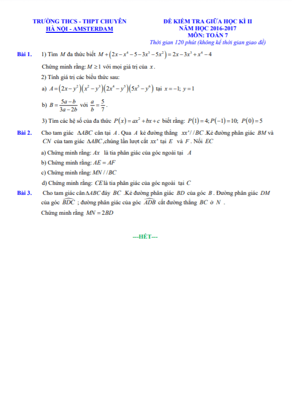 Đề kiểm tra giữa học kì 2 (HK2) lớp 7 môn Toán năm 2016 2017 trường chuyên Hà Nội Amsterdam