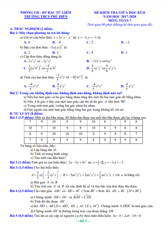Chào mừng quý thầy cô và các em học sinh lớp 7 đến với đề kiểm tra giữa học kì 2 môn Toán năm học 2017-2018 của trường THCS Phú Diễn ở Hà Nội. Đề thi bao gồm 04 câu trắc nghiệm (2 điểm) và 05 câu tự luận (8 điểm), thời gian làm bài là 90 phút (không tính thời gian giám thị phát đề).