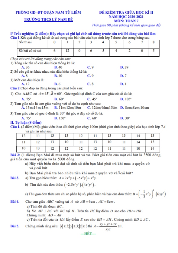 Đề kiểm tra giữa học kì 2 (HK2) lớp 7 môn Toán năm 2020 2021 trường THCS Lý Nam Đế Hà Nội