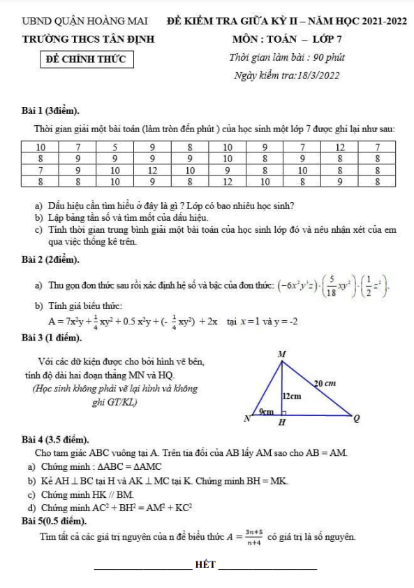 Chào quý thầy cô và các em học sinh lớp 7! Sytu xin giới thiệu đến quý vị đề kiểm tra giữa học kì 2 môn Toán lớp 7 năm học 2021-2022 tại trường THCS Tân Định, Hà Nội. Kỳ thi sẽ diễn ra vào ngày thứ Sáu, 18 tháng 03 năm 2022.