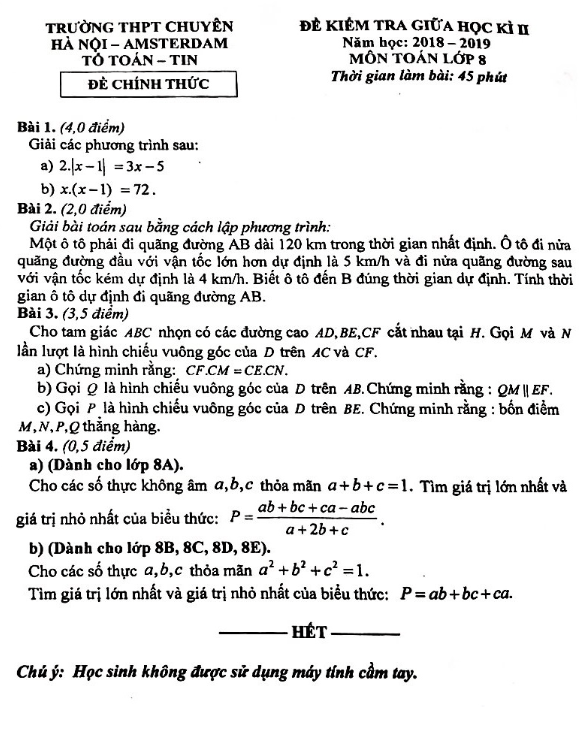Đề kiểm tra giữa kì 2 Toán lớp 8 năm 2018 – 2019 trường chuyên Hà Nội – Amsterdam