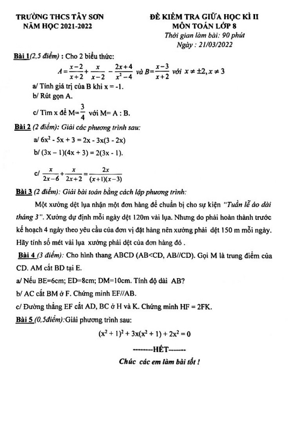 Đề kiểm tra giữa học kỳ 2 (HK2) lớp 8 môn Toán năm 2021 2022 trường THCS Tây Sơn Hà Nội