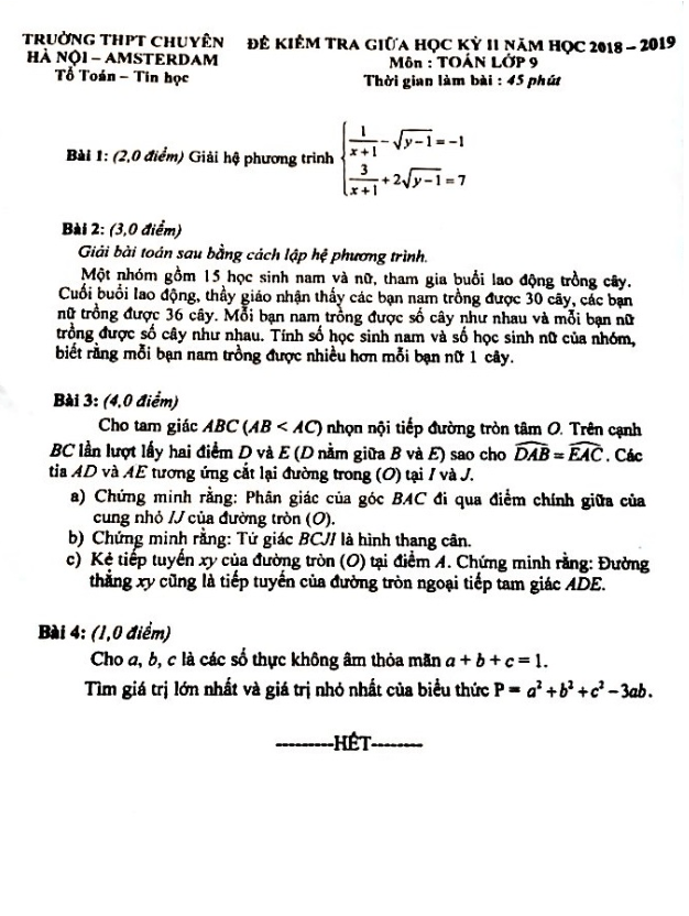 Đề kiểm tra giữa học kì 2 môn Toán lớp 9 năm học 2018-2019 của trường THPT chuyên Hà Nội – Amsterdam được thiết kế để kiểm tra kiến thức các chủ đề Toán mà học sinh đã học. Các chủ đề bao gồm giải hệ phương trình, giải toán bằng cách lập hệ phương trình, bài toán đường tròn, tìm giá trị lớn nhất và nhỏ nhất của biểu thức.