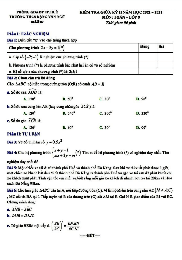 Đề kiểm tra giữa học kì 2 (HK2) lớp 9 môn Toán năm 2021 2022 trường THCS Đặng Văn Ngữ TT Huế