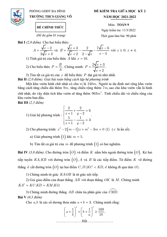 Xin chào quý thầy cô và các em học sinh lớp 9! Hôm nay chúng ta sẽ cùng tìm hiểu đề kiểm tra giữa học kì 2 môn Toán lớp 9 năm học 2021-2022 tại trường THCS Giảng Võ, quận Ba Đình, Hà Nội. Kỳ thi sẽ diễn ra vào sáng thứ Sáu, ngày 11 tháng 03 năm 2022.