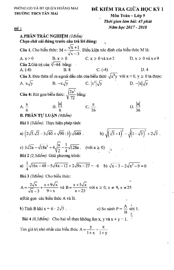 Đề kiểm tra giữa học kỳ I lớp 9 môn Toán năm học 2017 2018 trường THCS Tân Mai Hà Nội