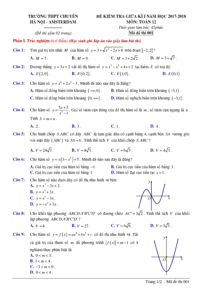Đề kiểm tra giữa học kỳ I năm học 2017 – 2018 môn Toán lớp 12 trường THPT chuyên Hà Nội – Amsterdam