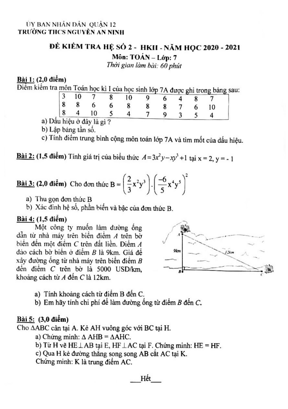 Sytu xin giới thiệu đến quý thầy cô và các em học sinh lớp 7 đề kiểm tra hệ số 2 Toán lớp 7 năm học 2020 – 2021 tại trường THCS Nguyễn An Ninh, quận 12, thành phố Hồ Chí Minh. Đề thi được thiết kế để đánh giá kiến thức và kỹ năng Toán của học sinh sau một học kì. Hy vọng các em sẽ tự tin và thành công trong kỳ thi này!